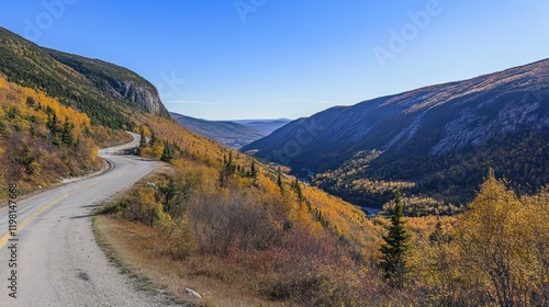 Winding mountain road with fall colors under a clear sky on a sunny day