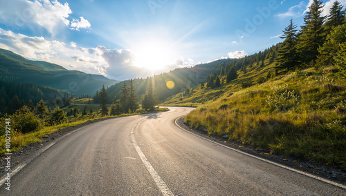 Winding mountain road with scenic views of the sun and surrounding landscape