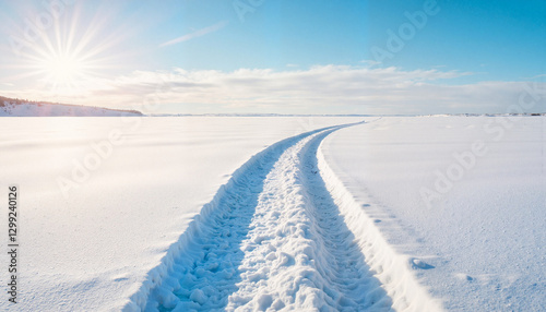 Winding slushy path through snowy flatlands at bright daylight, exploration