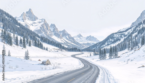 Winding winter road through snow-covered mountains and serene landscape