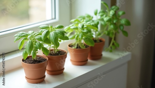 Window sill with four potted basil plants. Home decor, fresh herb gardening. Healthy basil leaves, green color. Herbal ingredient for cooking, healthy organic food, indoor gardening, lifestyle.