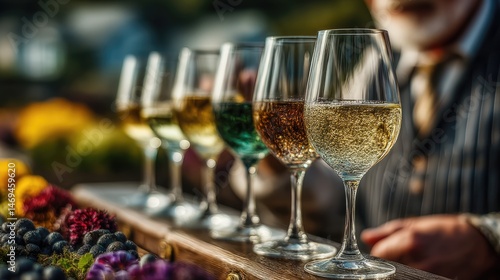 Wine tasting experience with glasses vineyard landscape elegant setting outdoor atmosphere