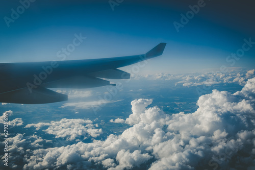 Wing of large passenger jet in mid flight above fluffy clouds and distand earth