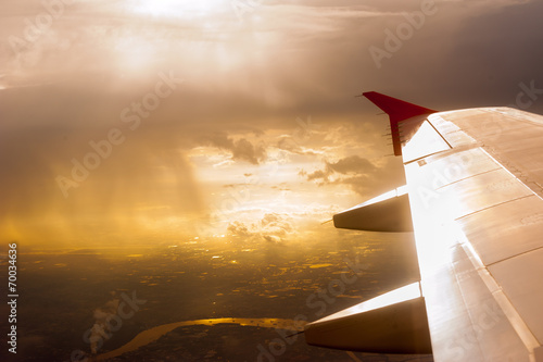 Wing of the plane on golden sky background