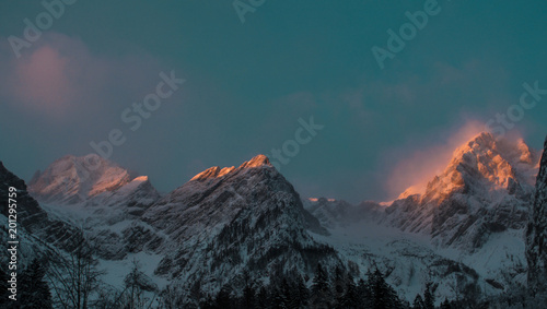 winter alpine mountain landscape during sunset, kamnik alps, slovenia.