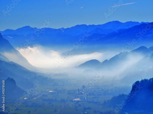 Winter atmosphere in spacious subalpine valley Seeztal along the Seez River between Lake Walensee and the Rheintal Valley, Walenstadtberg - Canton of St. Gallen, Switzerland (Schweiz)