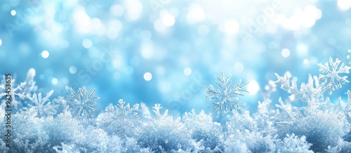 Winter background with snowflakes, bokeh lights, and icy blue atmosphere. Crystal-like ice pattern at the bottom, copy space above.