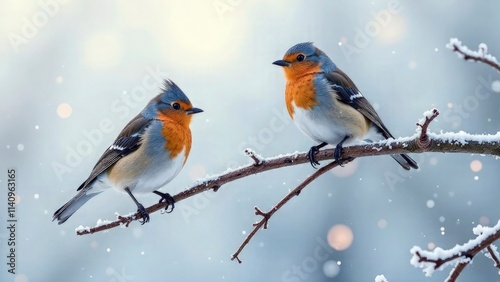 Winter birds perched on a frosted tree branch with a pale sky behind