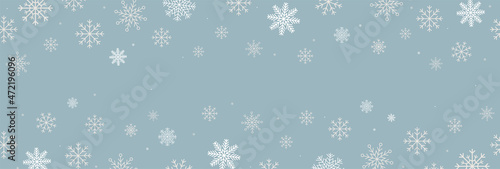 Winter blue background with snowflakes horizontal seamless pattern. White snowflakes on blue background. Vector snowflakes scattered banner. copy space for your text.