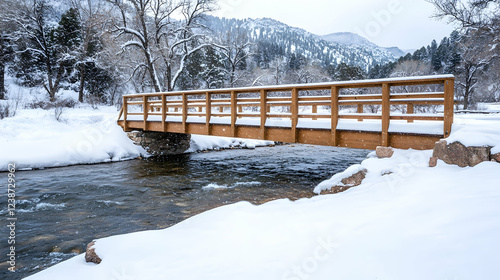 Winter bridge over snowy stream, mountain backdrop; ideal for travel brochures