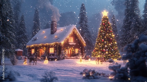 Winter Cabin Decorated with Christmas Tree and Snowfall