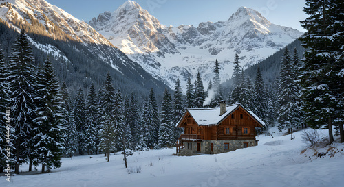 Winter Chalet Nestled Among Snow Capped Mountains And Evergreen Forest