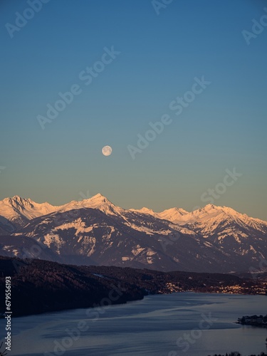 Winter dawn landscape over the Millstatter See in Carinthia, Austria, full moon