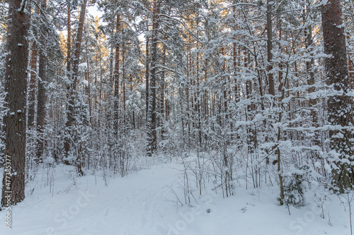 Winter forest calendar landscape with snowy pine tree forest and shrubs