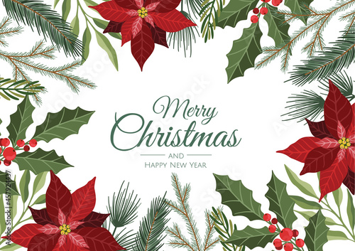 Winter holiday background. Border with Christmas tree branches and decorations. Great for New Year cards, banners, headers, party posters.