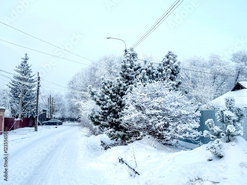 winter landscape with a trees covered with snow and frost