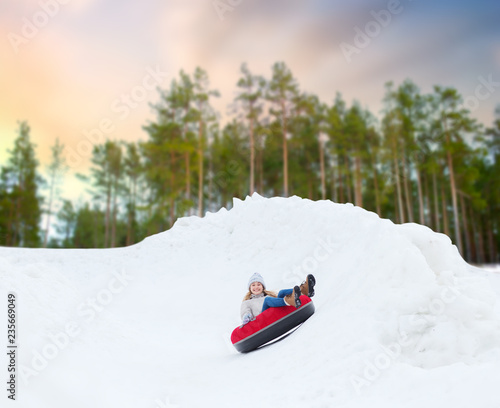 winter, leisure and entertainment concept - happy teenage girl sliding down hill on snow tube
