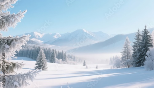 Winter mountain landscape with snow-covered pine trees and hazy background. Beautiful nature scenery for travel brochure background and holiday greeting card.