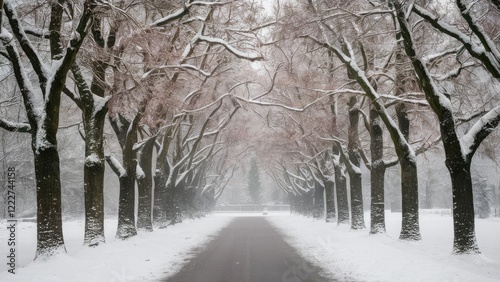 Winter scene featuring snow-covered trees lining a serene pathway with soft light filtering through branches creating a tranquil atmosphere.
