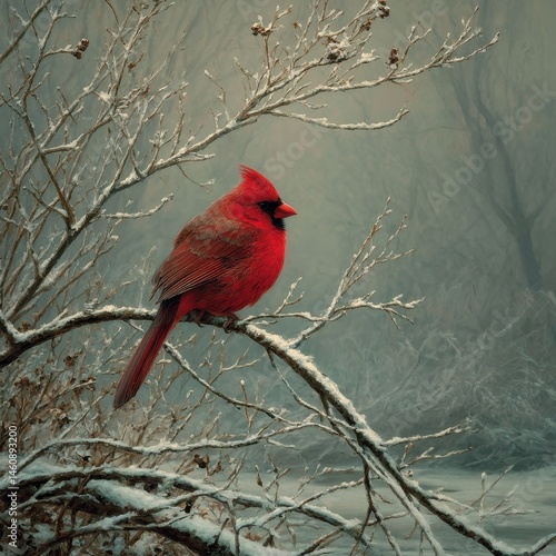 Winter scene with a vibrant cardinal perched on a snow-dusted branch.