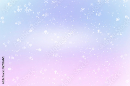 Winter shiny snowflakes blurred background in light blue pink colors. Blurry Christmas holiday background with snow flakes, frost pattern, soft flares of light. Copy space
