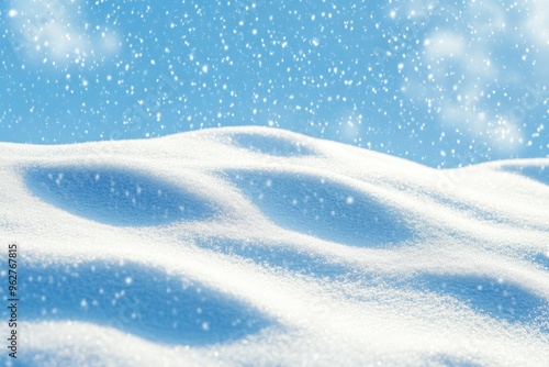 Winter snow background with snowdrifts, with beautiful light and snow flakes on the blue sky in the evening, banner format, copy space with generative ai
