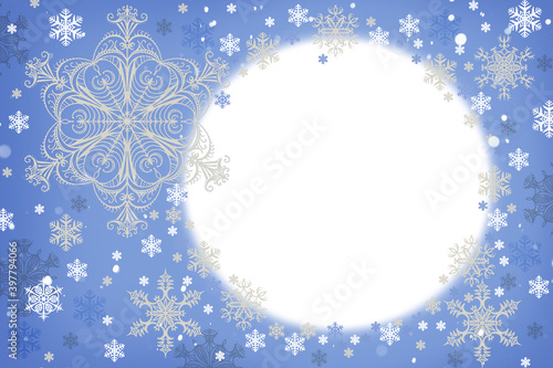 Winter snowy background drawn lace snowflakes on blue backdrop with place for text