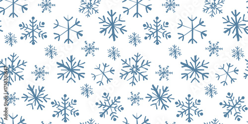 Winter vector seamless pattern with snowflakes in doodle style. Snowy background in Scandinavian style for textile, fabric, print, package, wallpaper, wrapping paper. Christmas simple art