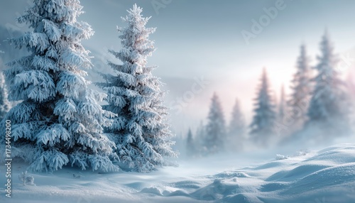 Winter Wonderland: Beautiful Snowy Landscape With Snowdrifts And Frosted Fir Trees. Seasonal Scenery Featuring Frosty Hills And A Serene Atmosphere.