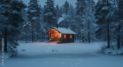 Winter Wonderland Cabin by Frozen Lake - Serene winter scene, cozy cabin, snowy forest, frozen lake, midnight sun glow. Symbolizing peace, solitude, warmth, escape, and nature
