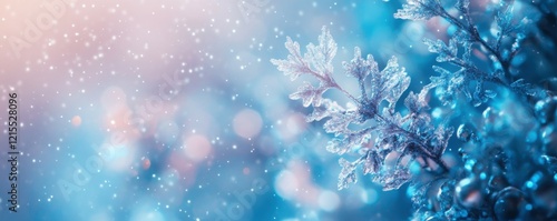 Winter wonderland: frost-covered branches with falling snow and soft illumination