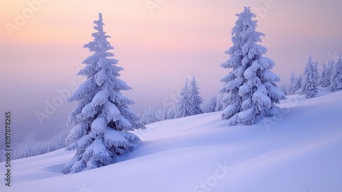 Winter wonderland landscape snow-covered pines serene environment early morning light nature photography