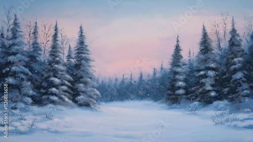 Winter wonderland landscape. Snowy forest at dawn. Concept of peace, serenity, and winter beauty.