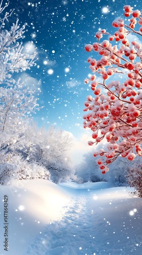 Winter wonderland landscape with snow-covered trees and red berries