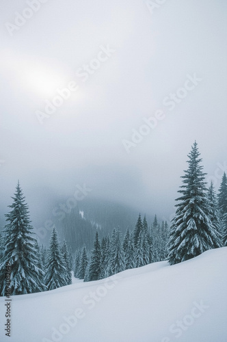 Winter Wonderland's Serenity: A tranquil winter landscape reveals snow-covered evergreen trees, shrouded in a gentle mist, capturing the serene beauty of nature's winter embrace.