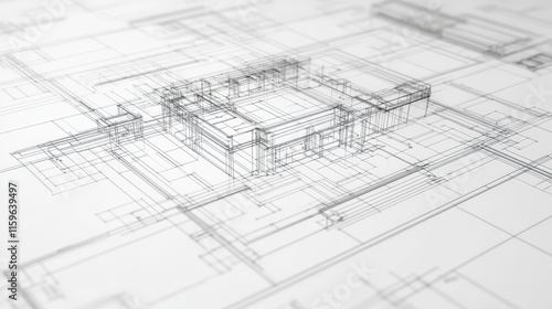 Wireframe blueprint drawing of 3D building. Vector architectural template background.