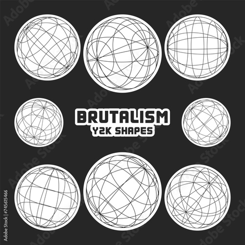 Wireframe shapes, lined sphere. Perspective mesh, 3d grid. Modern trendy low poly geometric elements. Retro futuristic design elements, y2k, vaporwave and synthwave style. Vector illustration