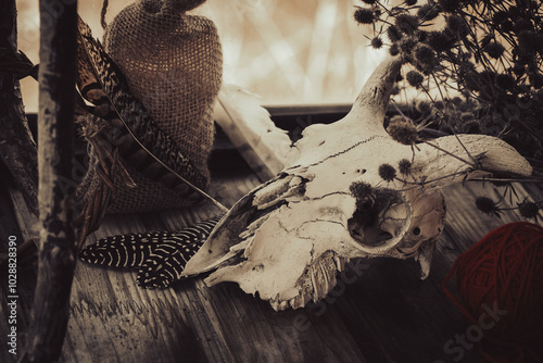 Witchy dusty treasures. Goats skull, dry herbs, birds features, canvas bag on a wooden shelf, selected focus.