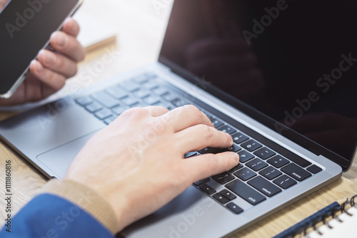 With an office setting blurred in the background, the image presents a close-up of male hands typing on a state-of-the-art laptop keyboard