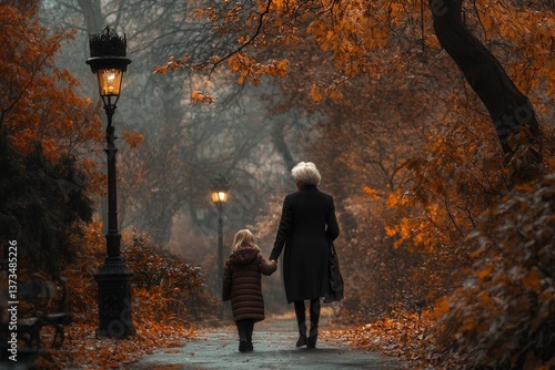 Woman and child walk hand in hand through a misty autumn park, surrounded by vibrant orange foliage.