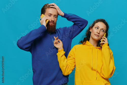 Woman and man cheerful couple with phones in their hands crooked smile cheerful, on blue background. The concept of real family relationships, talking on the phone, work online.