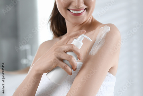 Woman applying body cream onto arm in bathroom, closeup