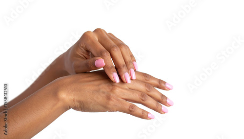 Woman applying moisturizer on her hands with pink nail polish on transparent background