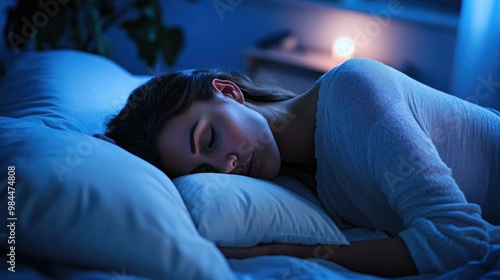 Woman asleep in bed with her head resting on a pillow, the room is dimly lit with soft blue tones