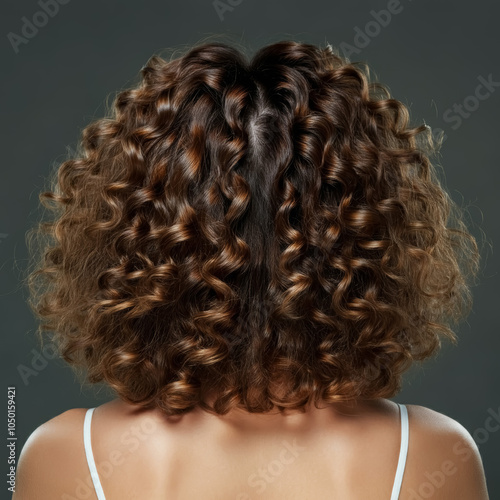 Woman back and healthy haircare on dark studio, beauty and natural curls, texture and growth with balayage for transformation. Model girl cosmetics and shine, results and shampoo, glow and salon