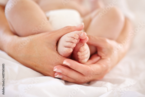Woman, child and feet closeup for love connection or childhood bonding, motherhood or newborn. Female person, infant and toes or care support for kid growth development, parent trust or nurture youth