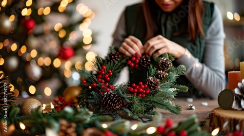Woman Crafting Christmas Wreath with Pine Cones and Red Berries for Holiday Decor