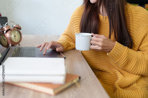 woman drinking coffee after taking a break from using the computer