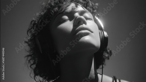 Woman Enjoying Music with Headphones in Black and White