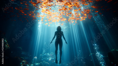 Woman floats ocean depths, sunbeams, fish swarm, tranquility, underwater meditation